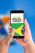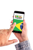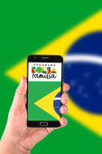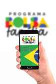Zdjęcie "Osoba posiada smartfon wyświetlający informacje o programie opieki społecznej Bolsa Famlia.." może być wykorzystywane do celów osobistych i komercyjnych zgodnie z warunkami zakupionej licencji Royalty-free. Obraz jest dostępny do pobrania w jakości wysokiej rozdzielczości do 5760x3840.