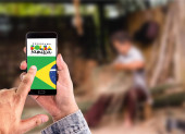 Osoba posiada smartfon wyświetlający informacje o programie opieki społecznej Bolsa Famlia..