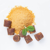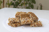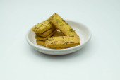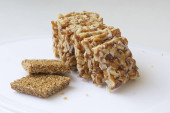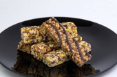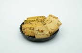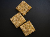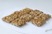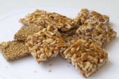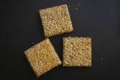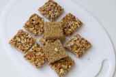 Til chikki i Peanut Chikki w szklanej misce na białym tle. Chikki jest indyjskie słodycze potrawy wykonane z jaggery i sezamu i orzeszków ziemnych. Indyjski festiwal Makar Sankranti specjalne słodkie.
