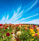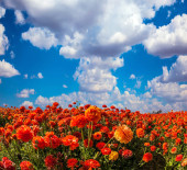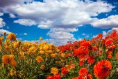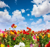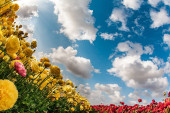 Kibuc Nir Yitzhak. Izrael. Wiosenny dywan kwitnący ogród jaskry-ranunkulus o różnych kolorach. Kibuc na granicy ze Strefą Gazy. Błękitne niebo i śnieżnobiałe chmury.
