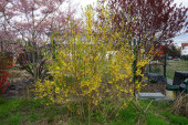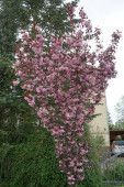 Magnolia x soulangeana kwitnie w kwietniu w pobliżu drzew iglastych Chamaecyparis lawsoniana. Magnolia x soulangeana, M. denudata x M. liliiflora, spodek magnolia, jest hybrydową rośliną kwitnącą z rodzaju Magnolia. Berlin, Niemcy.