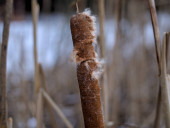 Fotografia z suchych trzcin, Typha Latifolia, zwany również bulrush, trzciny, cattail lub trawy corn dog, na brzegu zamarzniętego jeziora, czas zimowy