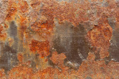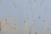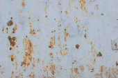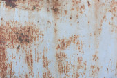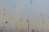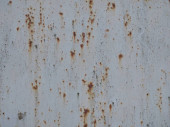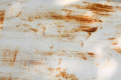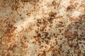 Metalowa powierzchnia pokryta rdzą i śladami zużycia. Kolor waha się od brązowego do białego, co wskazuje lata ekspozycji na działanie pogody. Tekstura jest szorstka i nierówna, wykazuje oznaki starzenia.
