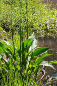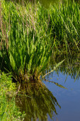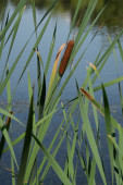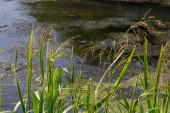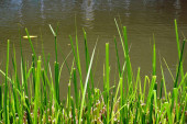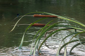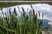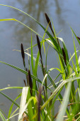 Obok wody stoi wąskolistny koktajl z widocznymi wysokimi liśćmi i brązowymi kolcami kwiatów. Ta roślina kwitnie w wilgotnej glebie..