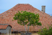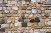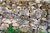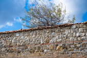 Zdjęcie "kamienna ściana wykonana z nierównych, jasnych klocków, zwieńczona grubą, pokrytą mchem betonową płytą, umieszczona przed ogrodzeniem drucianym i gołymi zimowymi gałęziami." może być wykorzystywane do celów osobistych i komercyjnych zgodnie z warunkami zakupionej licencji Royalty-free. Obraz jest dostępny do pobrania w jakości wysokiej rozdzielczości do 5760x3840.