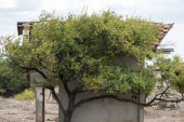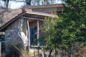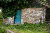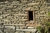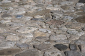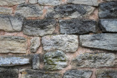 kamienna ściana wykonana z nierównych, jasnych klocków, zwieńczona grubą, pokrytą mchem betonową płytą, umieszczona przed ogrodzeniem drucianym i gołymi zimowymi gałęziami.