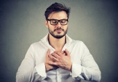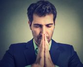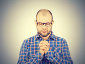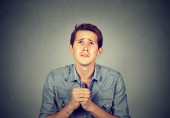 desperate young man showing clasped hands, pretty please asking help forgiveness
