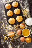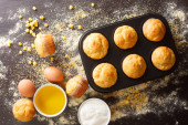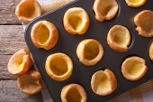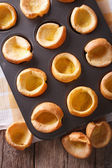 Yorkshire puddings in baking dish on the table. horizontal top v
