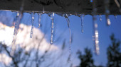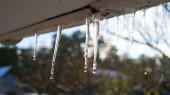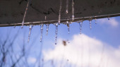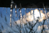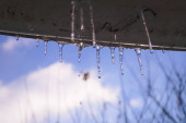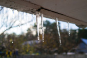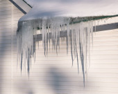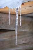 Oszałamiające sople zwisające z pokrytego śniegiem dachu na tle przejrzystego błękitnego nieba. Zimowa scena natury z długimi przezroczystymi formacjami lodu na okapie budynku w jasnym świetle słonecznym.