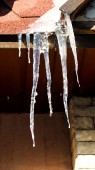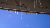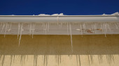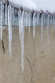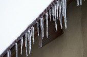 Oszałamiające sople zwisające z pokrytego śniegiem dachu na tle przejrzystego błękitnego nieba. Zimowa scena natury z długimi przezroczystymi formacjami lodu na okapie budynku w jasnym świetle słonecznym.