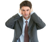 młody biznesmen bańki ręcznie za ucho na białym tle