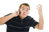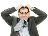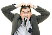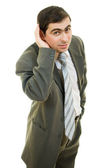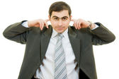 biznesmen objętych jego uszy rękami na białym tle.