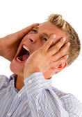 biznesmen ziewanie usta obejmujące ręce na białym tle.