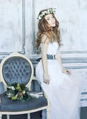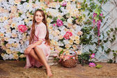 Mody i piękna młoda kobieta w zielony ściana kwiatów i liści