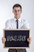 FAŁSZ - młody bizneswoman gospodarstwa tablica z tekstem