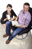 Zdjęcie "Córka z e czytnik i ojciec z tradycyjnej książki" może być wykorzystywane do celów osobistych i komercyjnych zgodnie z warunkami zakupionej licencji Royalty-free. Obraz jest dostępny do pobrania w jakości wysokiej rozdzielczości do 5760x3840.