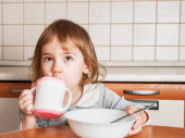 Mała dziewczynka zjada owsianka z siedzący przy stole.
