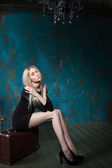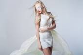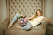 Mody i piękna młoda kobieta w zielony ściana kwiatów i liści