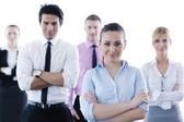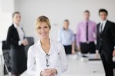 biznes kobieta stojąc z jej personelu w tle