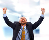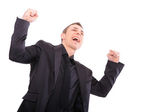 Mistrz biznesu człowiek stojący z pięści zaciśnięte w zwycięstwo
