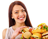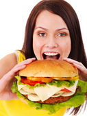 Mężczyzna i kobieta jedzenie duża kanapka z cola. Na białym tle.