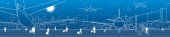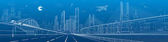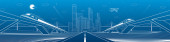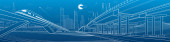 Infrastruktury panorama. Autostrady, kolejowego podróży na mosty, centrum biznesowe, architektura i miejskich, neonowe miasto, radar i wieża, białe linie na niebieskim tle, dynamiczne sceny, wektor sztuki projektowania