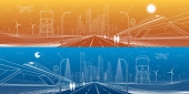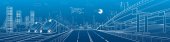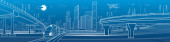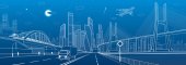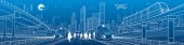 Zdjęcie "Infrastruktury panorama. Autostrady, kolejowego podróży na mosty, centrum biznesowe, architektura i miejskich, neonowe miasto, radar i wieża, białe linie na niebieskim tle, dynamiczne sceny, wektor sztuki projektowania" może być wykorzystywane do celów osobistych i komercyjnych zgodnie z warunkami zakupionej licencji Royalty-free. Obraz jest dostępny do pobrania w jakości wysokiej rozdzielczości do 5760x3840.