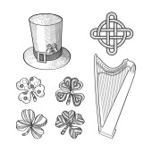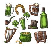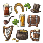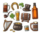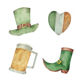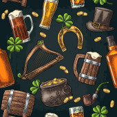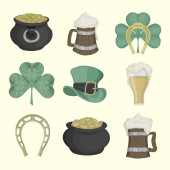 Saint Patrick Day. Pot monety, rury, piwo, liry, kapelusz, Podkowa