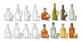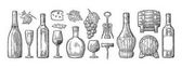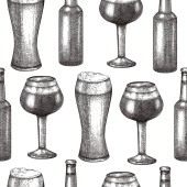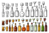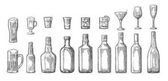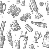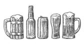 Piwo w komplecie kubek, tap, szkło, może, wieża, butelki, beczki, hop z liści, Kłos pszenicy. Kolor Vintage wektor Grawerowanie ilustracja na białym tle. Dla etykiet, opakowań, plakat