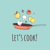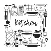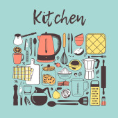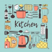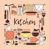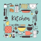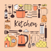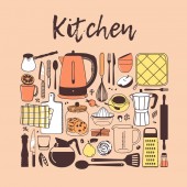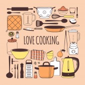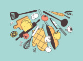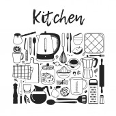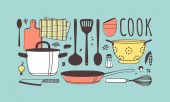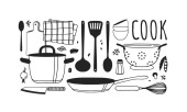 Ilustracja gotowania, narzędzia, naczynia i żywności. Dzieła sztuki twórczej atramentu. Rzeczywiste wektor rysunek. Zestaw kuchenny - wektor