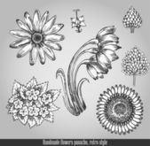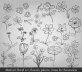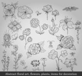 streszczenie kwiatowa sztuka, kwiaty, rośliny, przedmioty do dekoracji na szarym tle. Ilustracja wektorowa w stylu retro