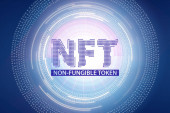 NFT, niezamienna koncepcja żetonów na ciemnozielonym futurystycznym tle. Złoty tekst NFT.