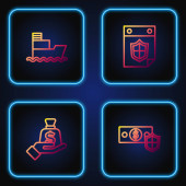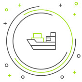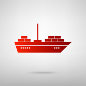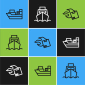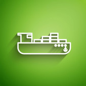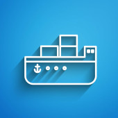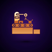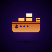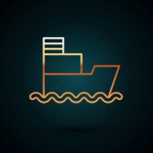 Złota linia statek towarowy z pudełkami usługi ikona odizolowany na ciemnoniebieskim tle. Dostawa, transport. Frachtowiec z paczkami, pudłami, towarami. Wektor.