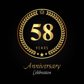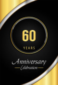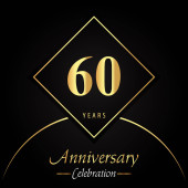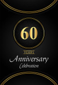 60-lecie logo ze złotymi wieńcami laurowymi, złotą koroną i złotą gwiazdą odizolowaną na czarnym tle. Projekt Premium na urodziny, wesela, kartka z życzeniami, plakat, ukończenie szkoły, ceremonia.