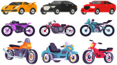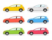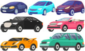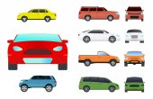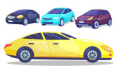 Zestaw kolorowych nowoczesnych samochod? w, samochod? w z przodu i z boku. Pojazd codziennego użytku z transportu. Transport, taksówka. Wygodny samochód do jazdy. Samochód sedan lub hatchback z przyciemnianymi szybami
