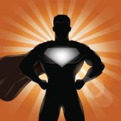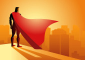 Superhero black silhouette on grunge sunburn background. Superhero over vintage background. Superman wear red cloak with sunset, sunrise or explosion behind. Retro classic american poster style.