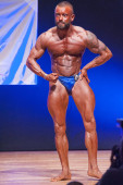 Kulturystą wygina swoje mięśnie, aby pokazać jego ciała