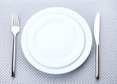 białe puste talerze z widelcem i nożem na szary Obrus