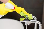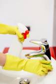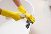 Ręce z żółtym gumowe rękawice ochronne czyszczenia łazienkowej
