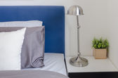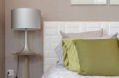 szary poduszkę na białe łóżko w nowoczesnej sypialni z czarnym światłem