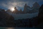 Szczyt Fitz Roy w różowy świt i refleksje w jeziorze.