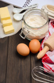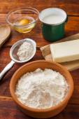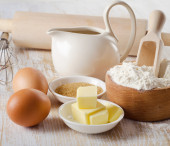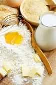 Składniki do pieczenia - mleka, masła, jajka i mąki.