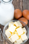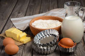 Składniki do pieczenia - mleka, masła, jajka i mąki.