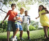 Ojciec gry w piłkę nożną z dziećmi