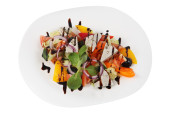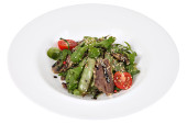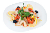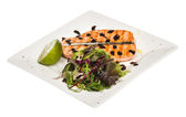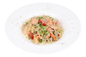 Sałatka z łososia smażone w okrągłej białej płycie na białym tle strzał studio.