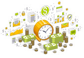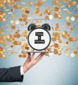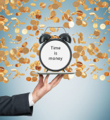 A big golden dollar sign and clock in the center, a hand drawing different coloured graphs and pictures around it, 'business', 'success', 'strategy' written around.