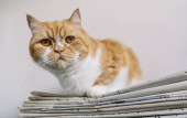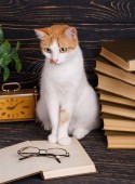kot, czytając książkę na ramionach