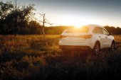 Białe nowoczesny samochód po pobycie na żółtym polu w jesieni