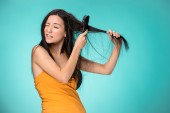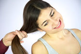brunetka modelki coraz włosy matowe przez salon fryzjerski