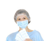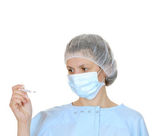 portrait of a man wearing a santa costume with a mask on his face, isolated on white background